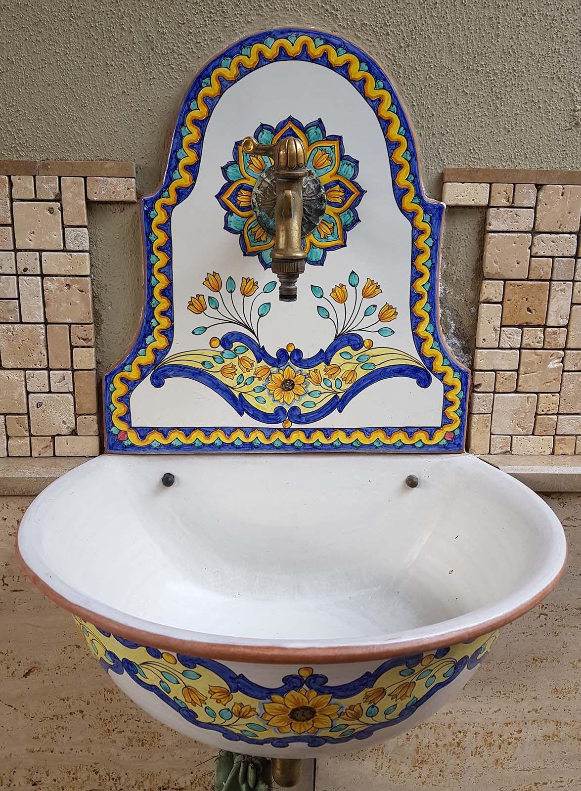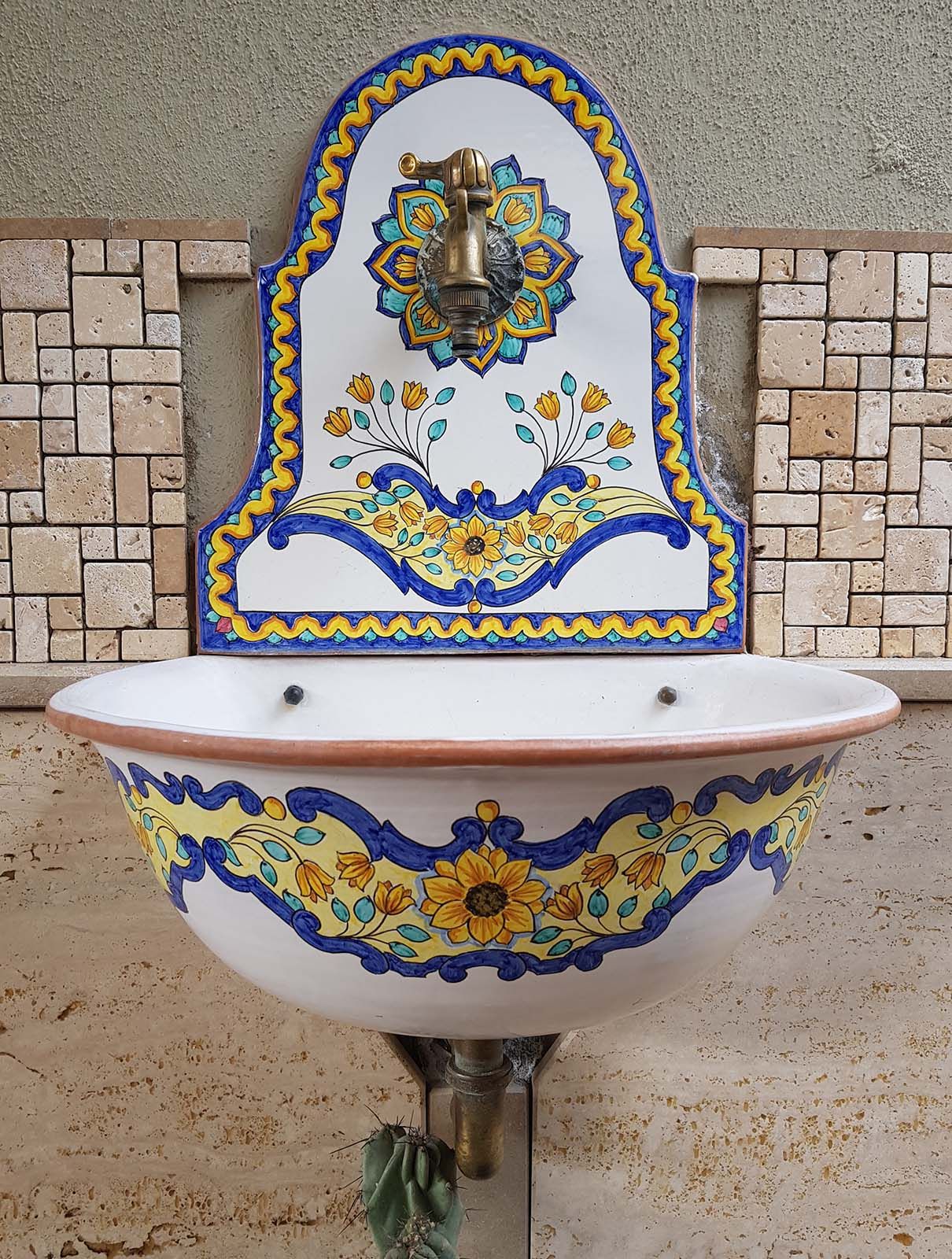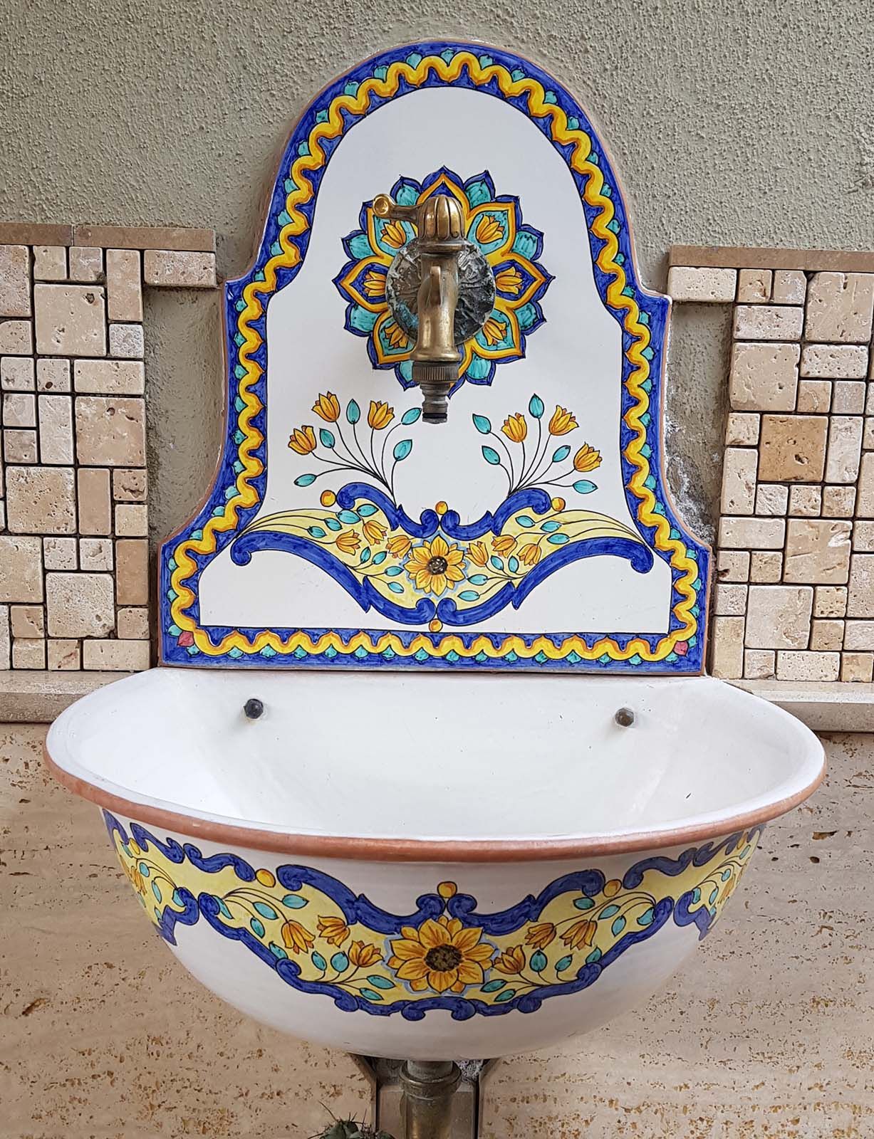 Questa fontana da muro con vasca è un’opera di artigianato vietrese realizzata e decorata interamente a mano. Le sue forme armoniose e i vivaci la rendono un elemento d’arredo capace di trasformare qualsiasi ambiente esterno in un angolo ricco di fascino mediterraneo.