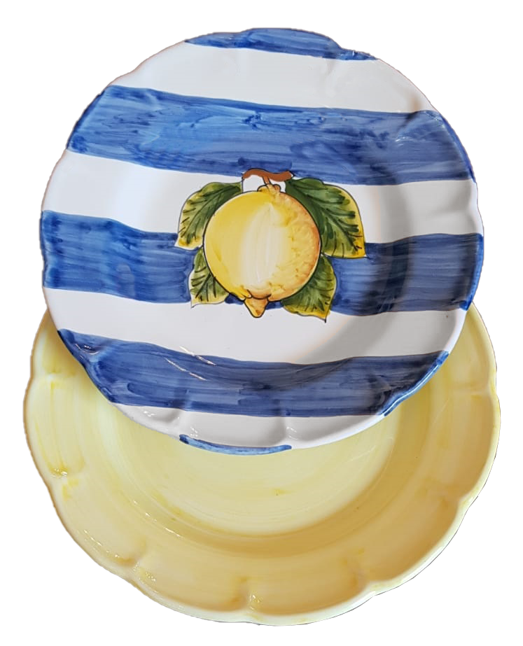 Piatti in ceramica di vietri linea righe e limone, pennellati fondo giallo - Bis piatto fondo e piatto piano
