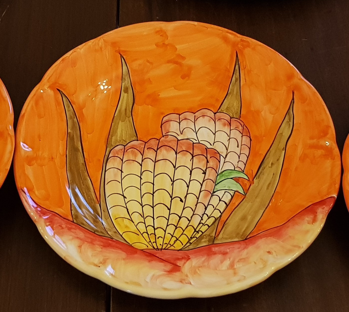 Piatto linea Pesci, soggetto conchiglia fondo arancione.Ceramica di Vietri -disponibile fondo, piano, frutta/dolce o sottopiatto