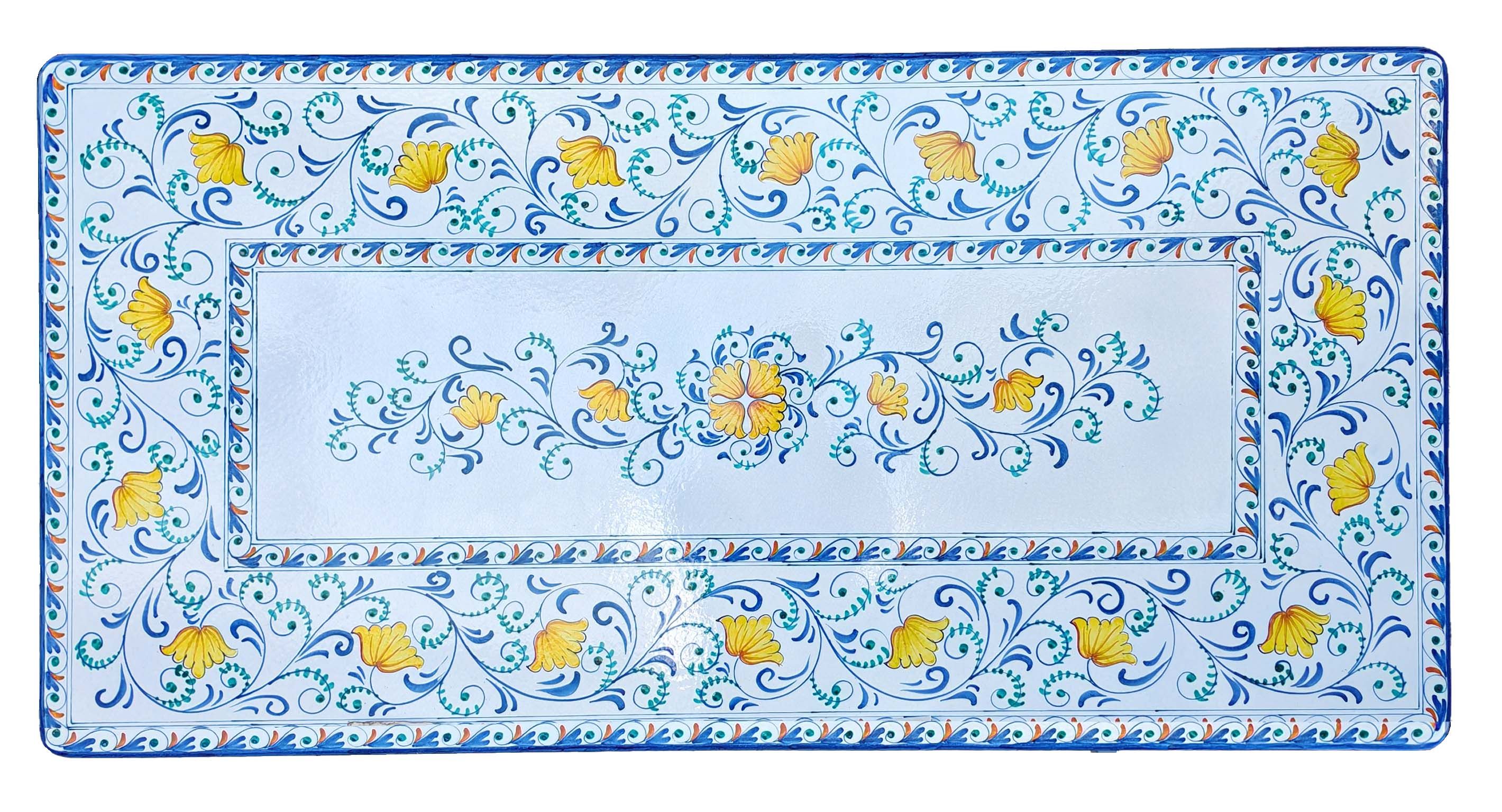 Elegante e resistente tavolo artigianale realizzato in pietra lavica dell’Etna, ceramizzata e dipinta a mano da maestri artigiani con i colori e la tradizione della Costiera Amalfitana.