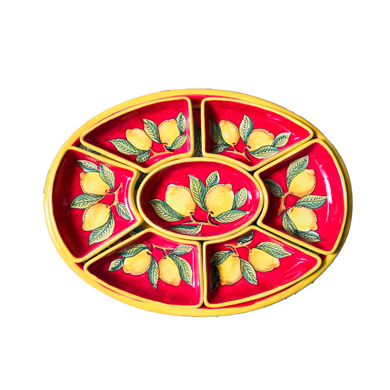 Antipastiera. Cena Fredda. 7 pezzi. Linea Limoni fondo rosso. Ceramica Di vietri. Dipinta a mano.