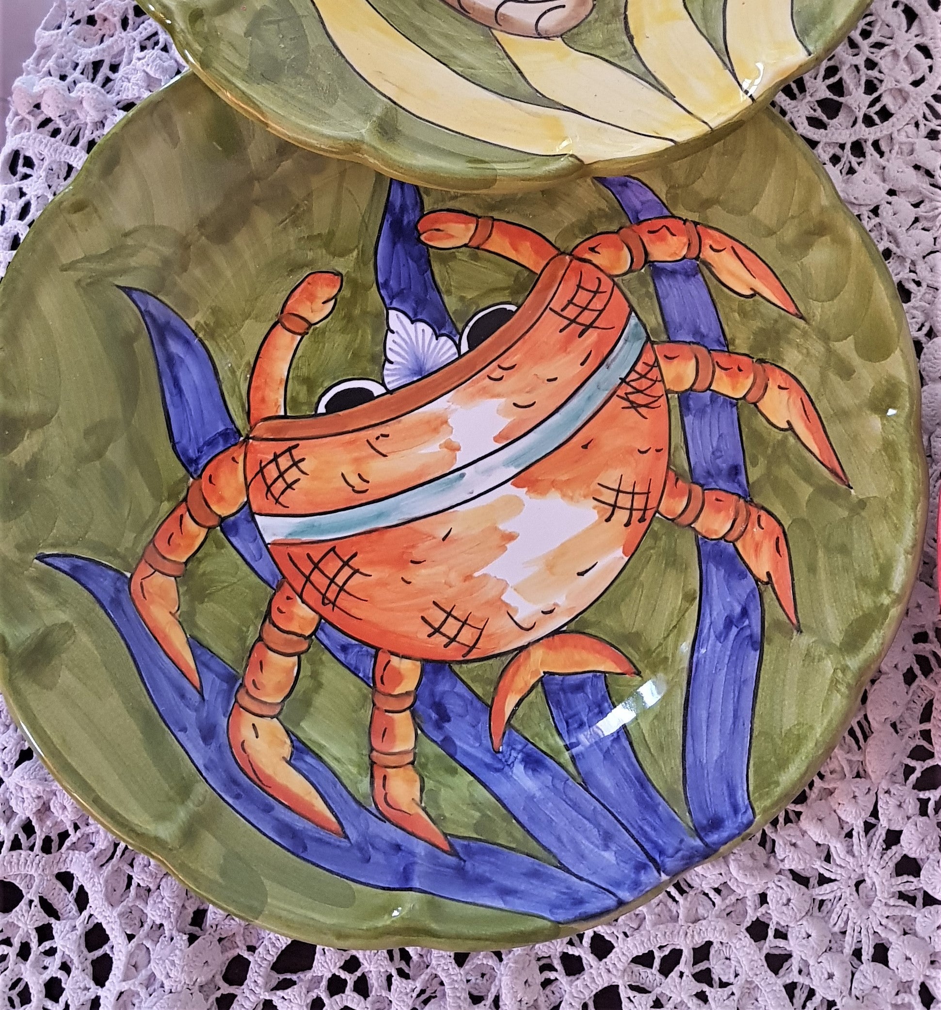 Piatto linea Pesci, soggetto granchio fondo verde acido . Ceramica di Vietri - fondo, piano, frutta/dolce o sottopiatto
