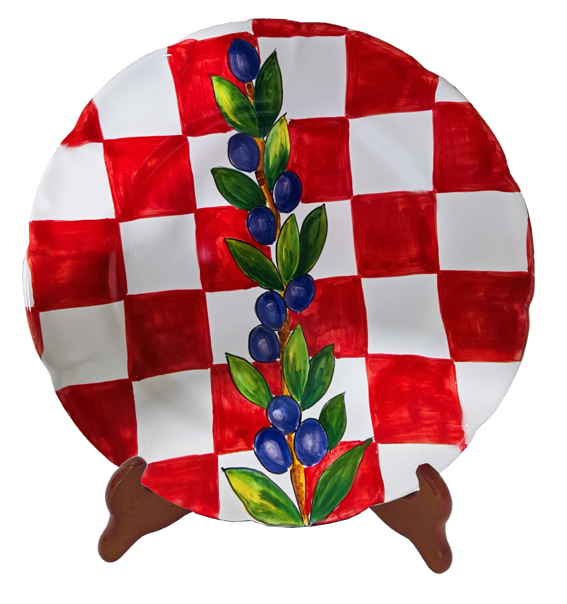 Piatto linea righe, quadri rossi soggetto olive. Ceramica di Vietri- disponibili fondi, piani, frutta/dolce o sottopiatti