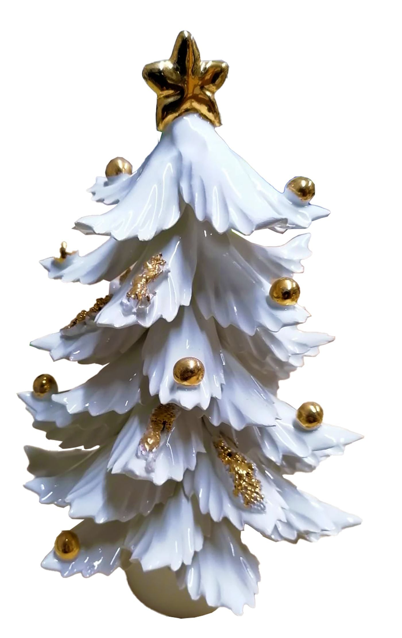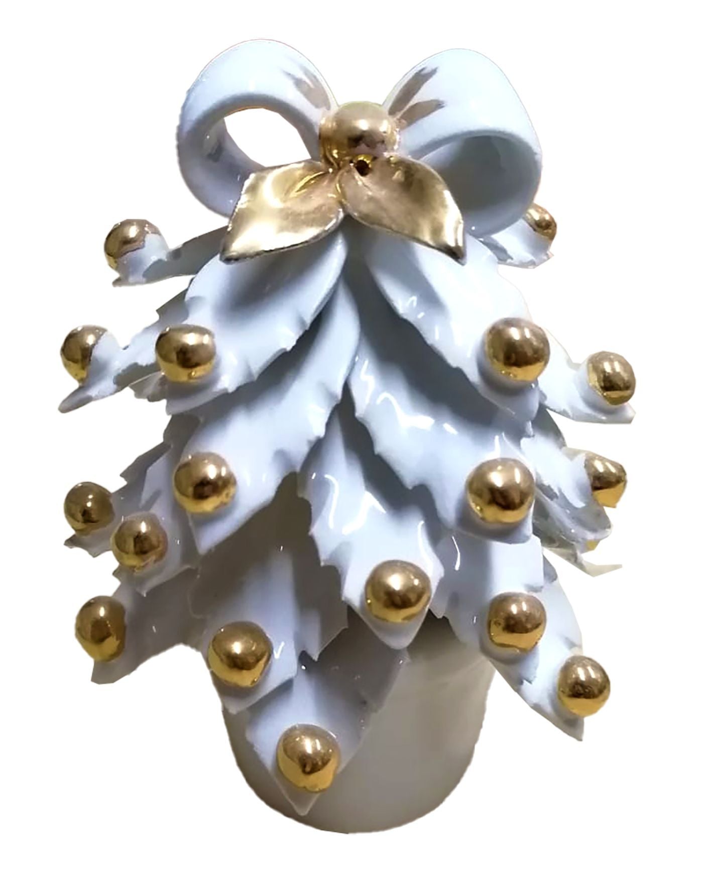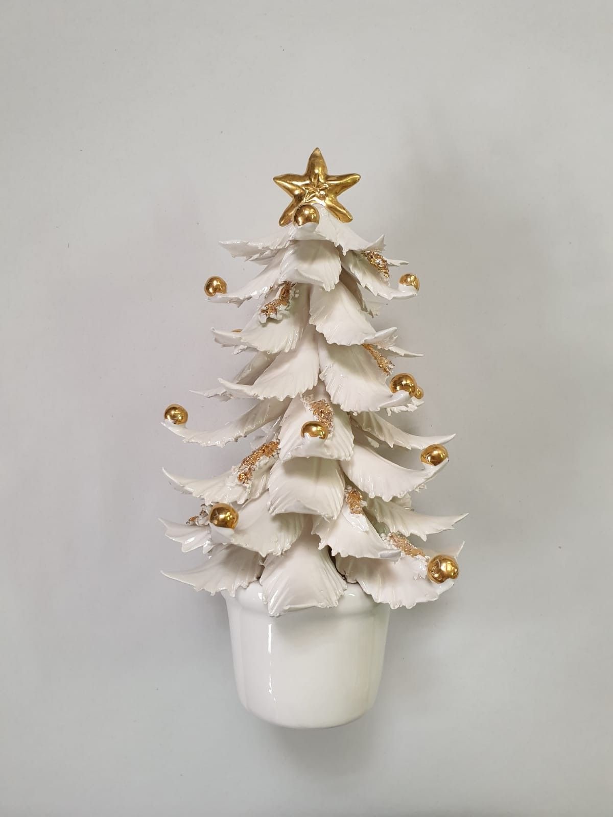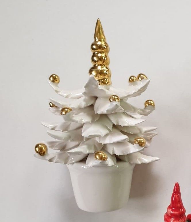 La forma stilizzata e armoniosa è impreziosita da una luminosa finitura bianco lucido, che esalta la purezza delle linee e la cura dei dettagli. Le delicate sfere oro applicate a mano decorano i rami con un tocco prezioso, mentre la punta dorata dona slancio e luminosità all’intera composizione. La base a vaso completa il design con equilibrio ed eleganza.