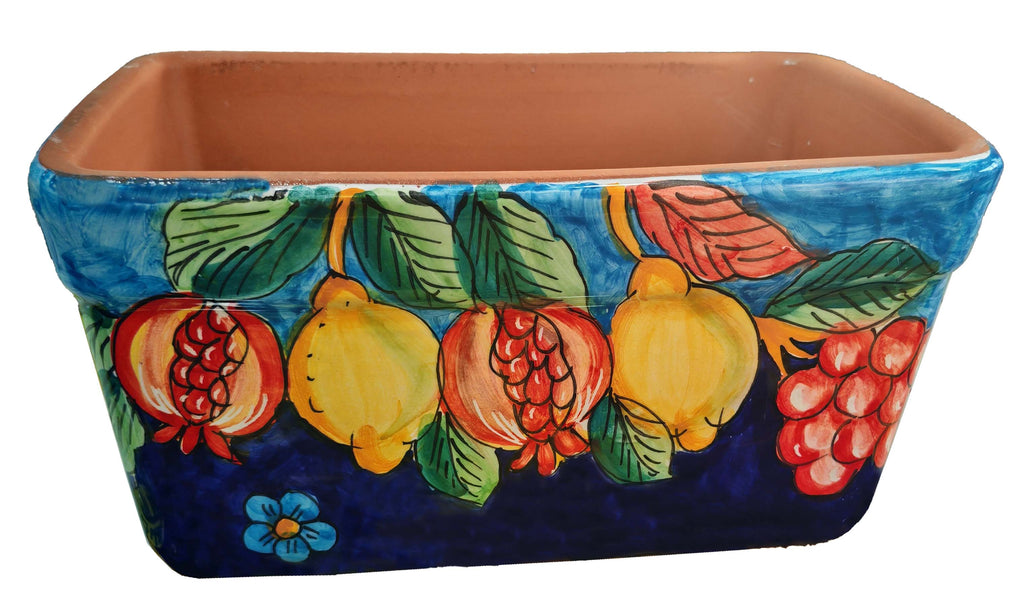 Fioriera a Cassetta Rettangolare -Fondo Giallo/Blu, Uva, Melograni e Fiori