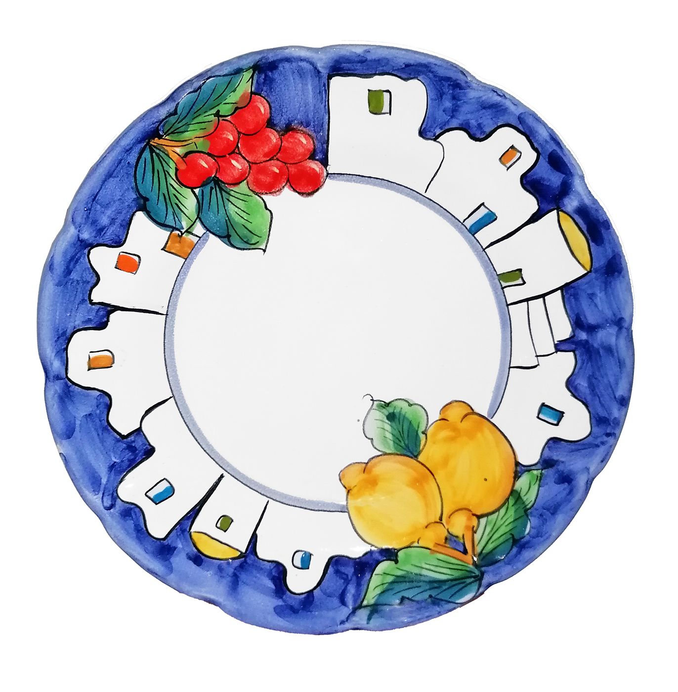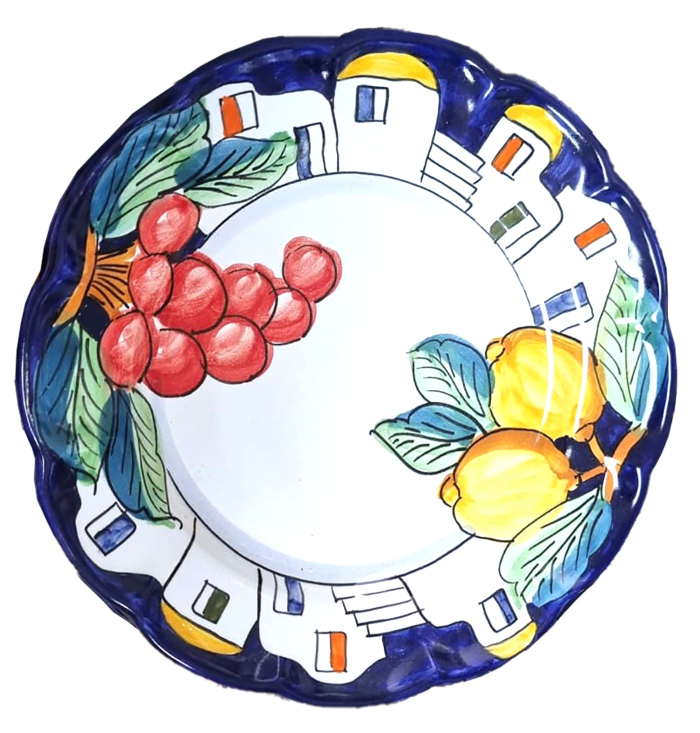 Piatto linea casette e limoni col Blu. Ceramica di Vietri. Disponibile piano, fondo, frutta/dolce o sottopiatto.