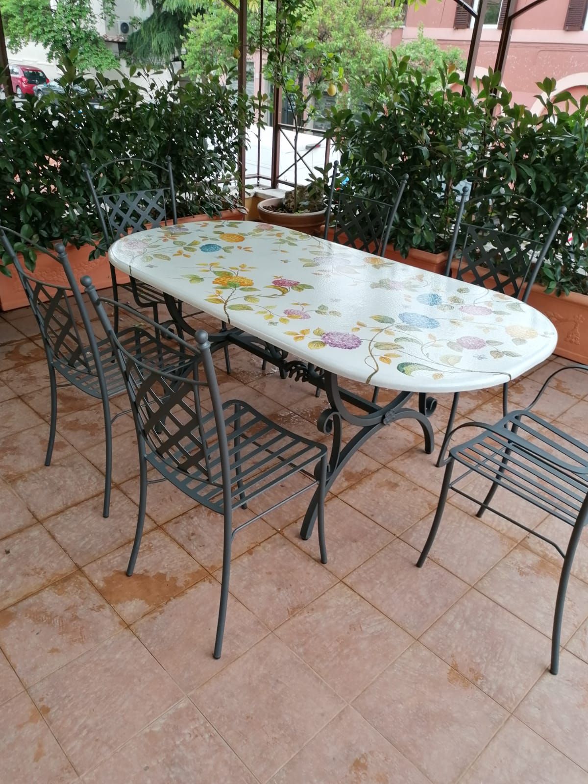 La struttura del tavolo è in ferro battuto, realizzata a mano e verniciata a fuoco, combinando eleganza e solidità per completare un design completamente artigianale.