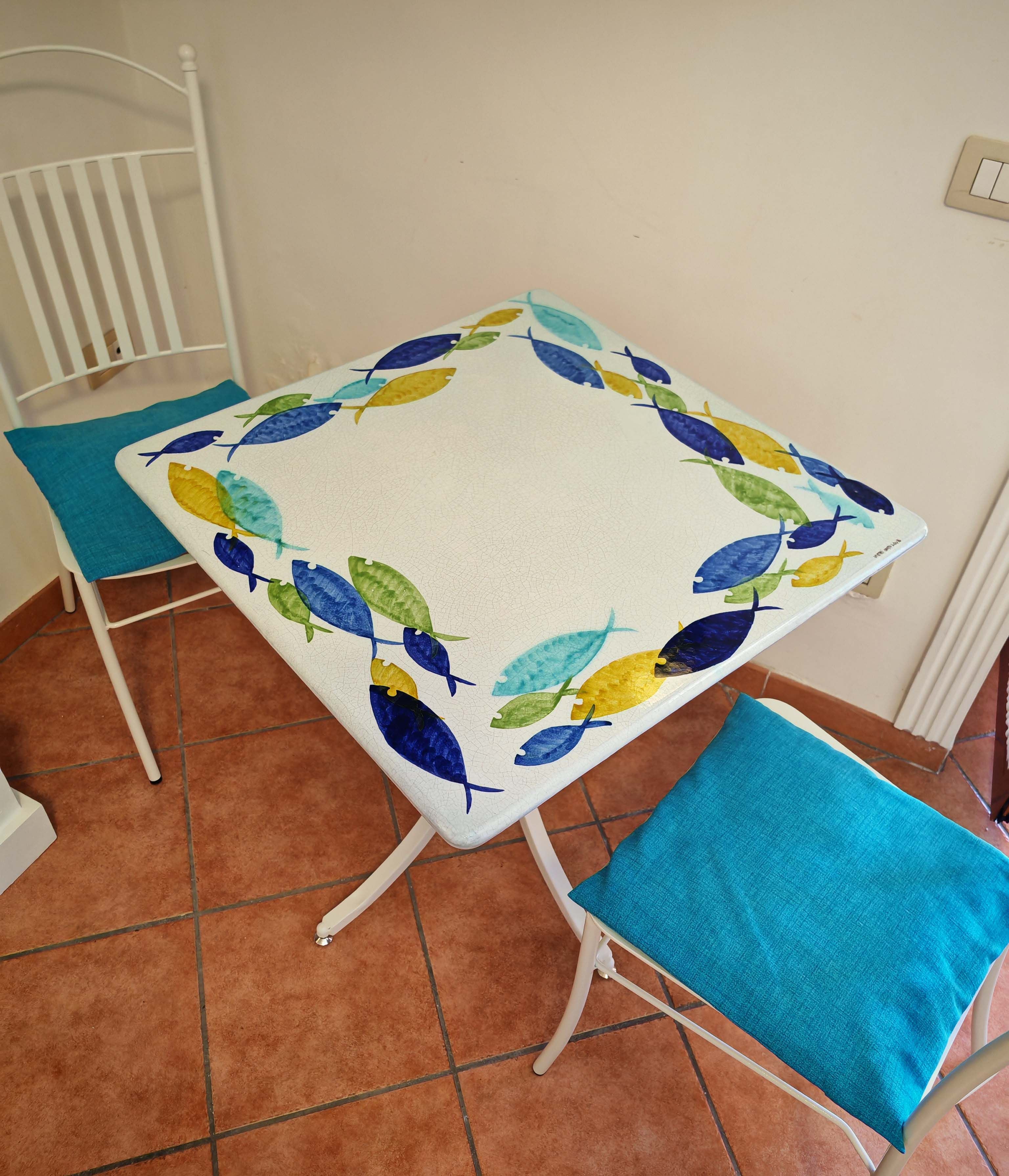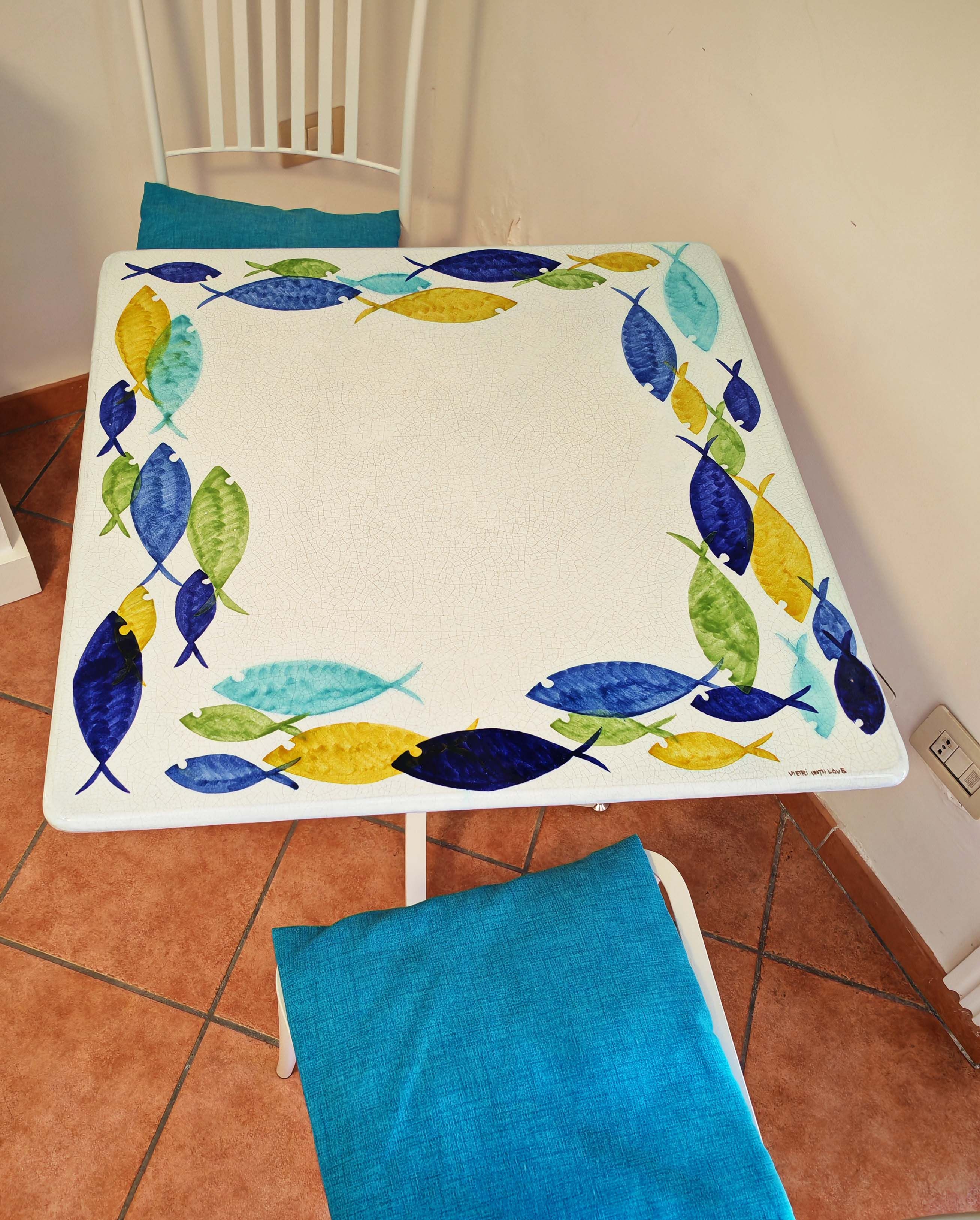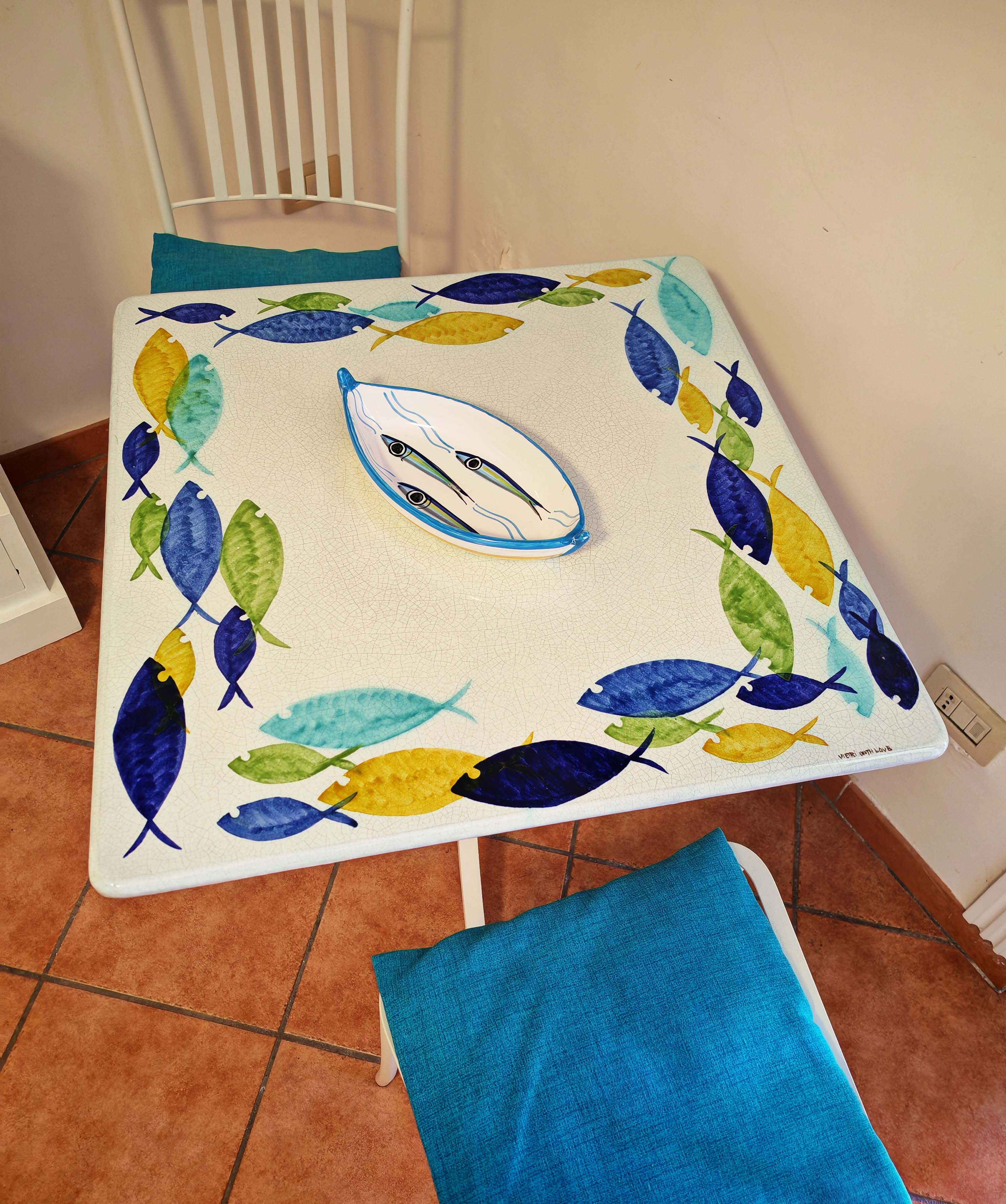 Tavolo in pietra lavica ceramizzata. Pesci Circolari. dipinto a mano. Ceramica di Vietri