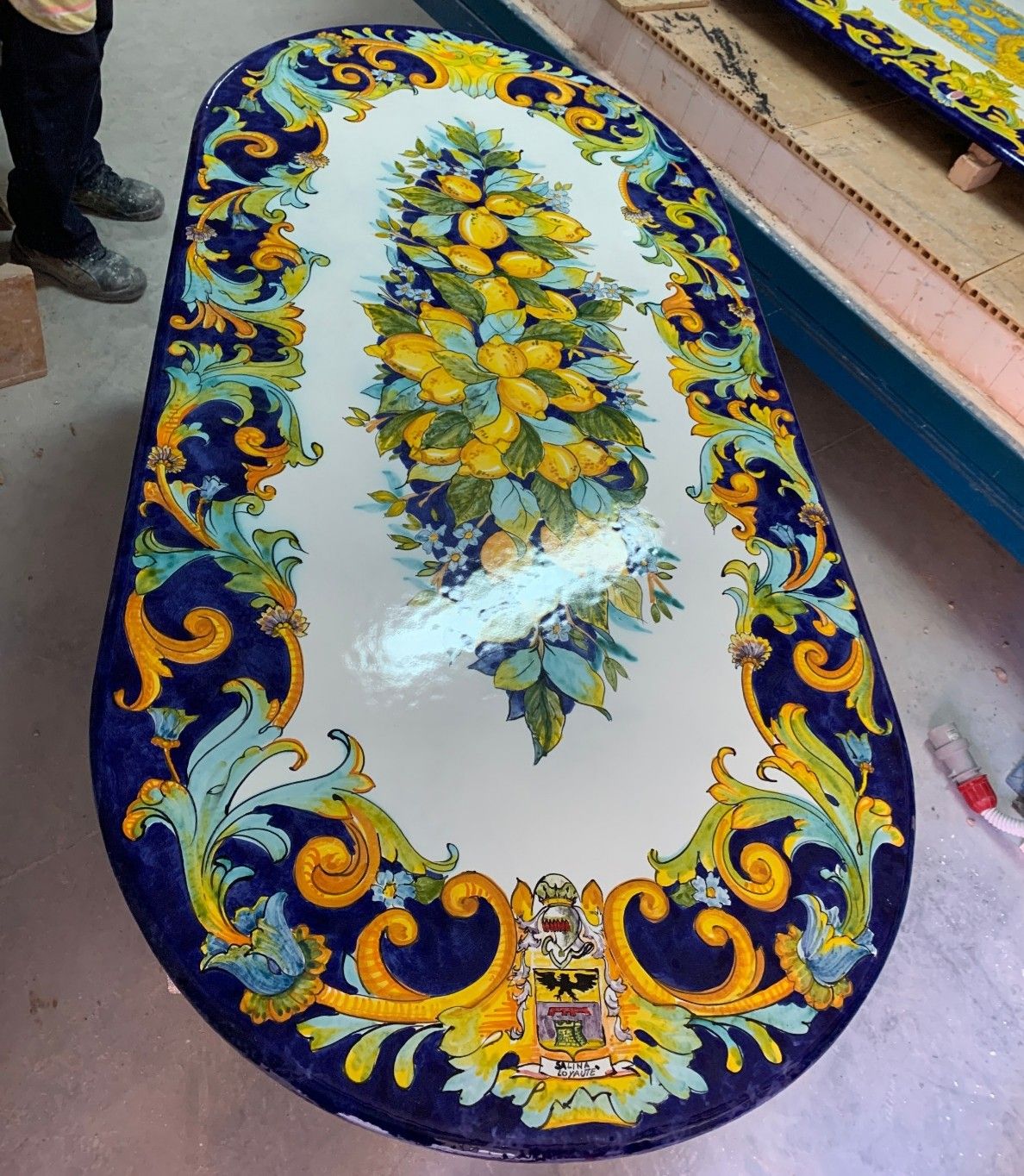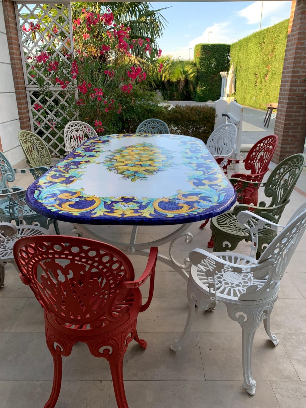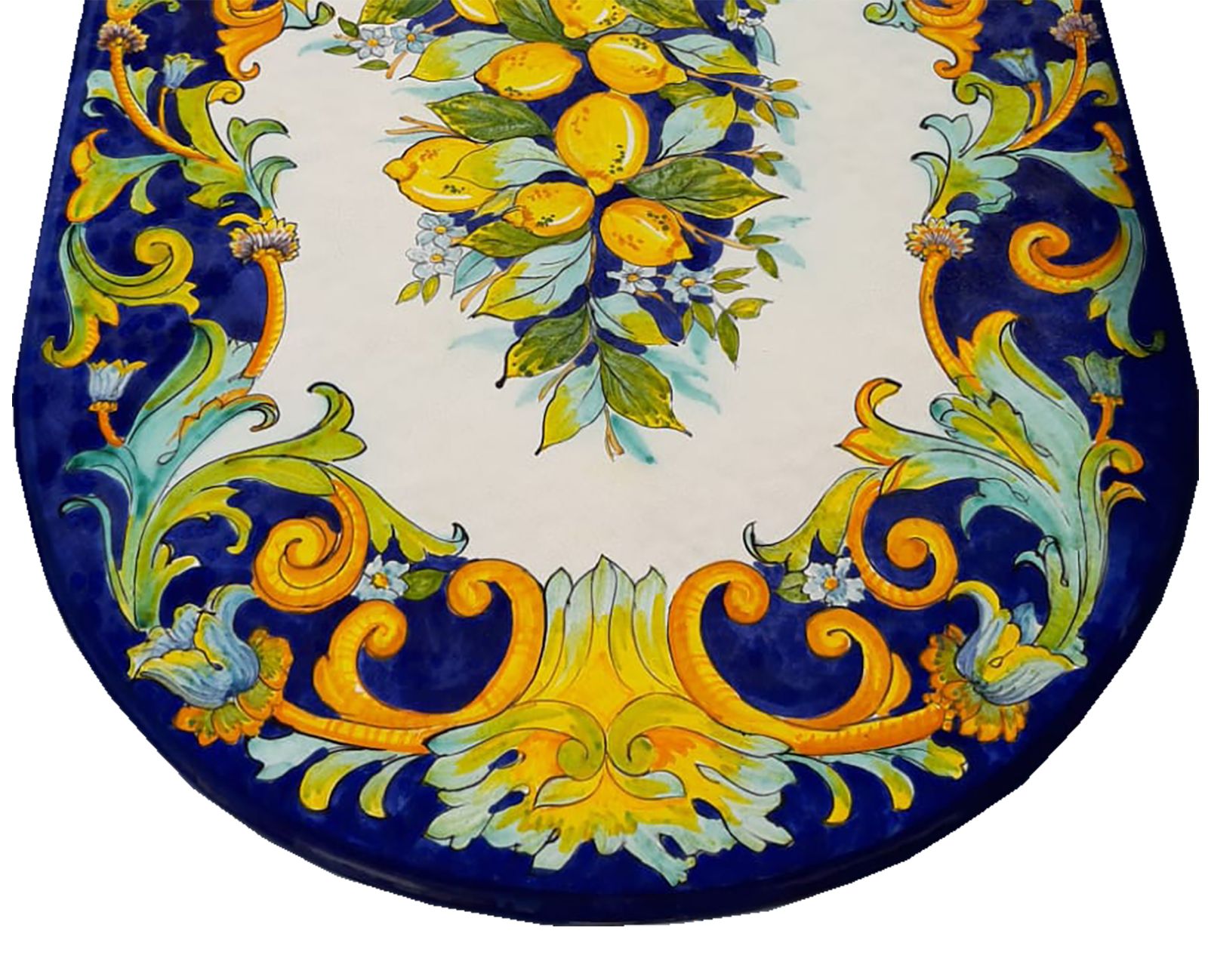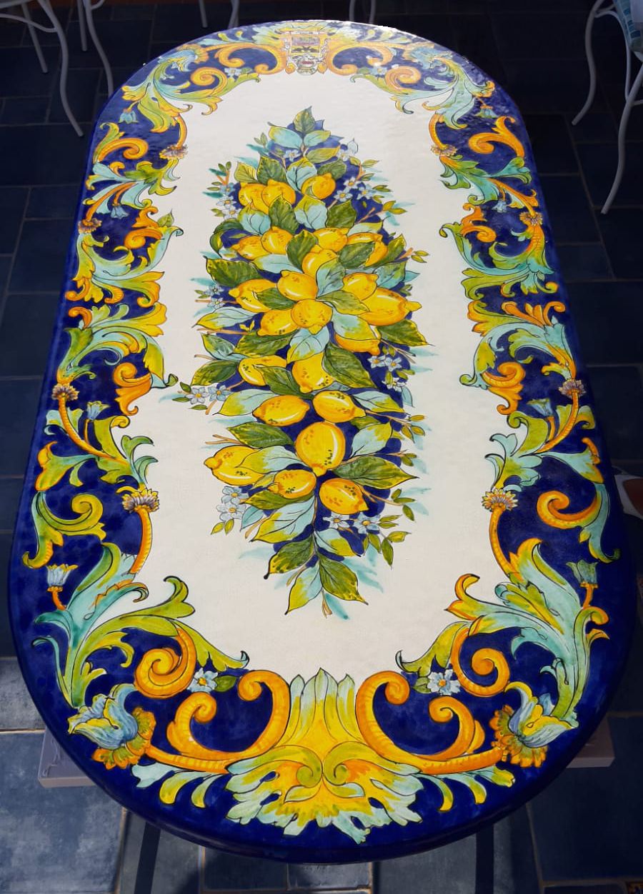 Elegante e resistente tavolo artigianale realizzato in pietra lavica dell’Etna, ceramizzata e dipinta a mano da maestri artigiani con i colori e la tradizione della Costiera Amalfitana.