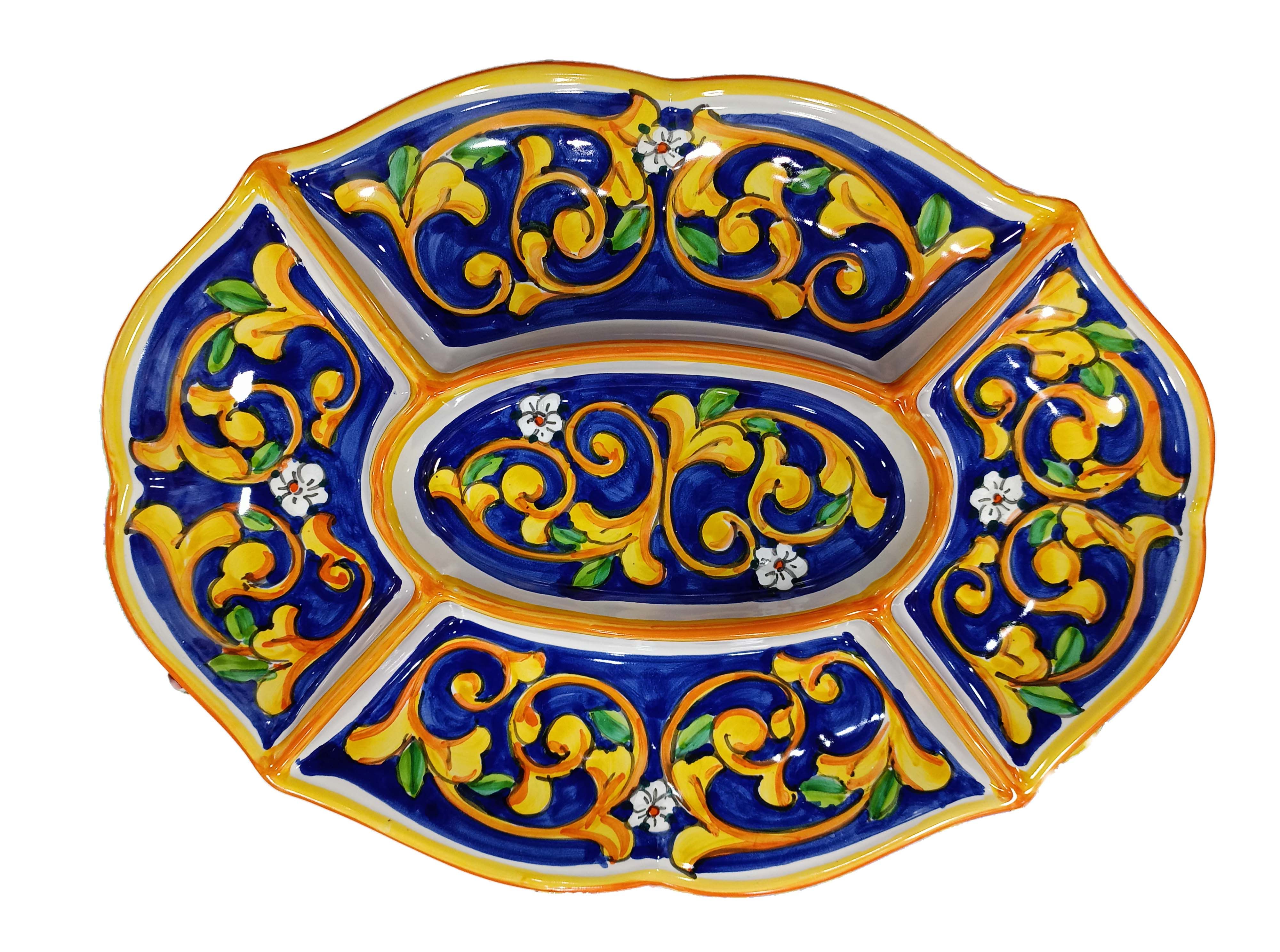 Antipastiera Cena Fredda 5 scomparti linea Barocco e Fiori. Ceramica di Vietri dipinta a mano