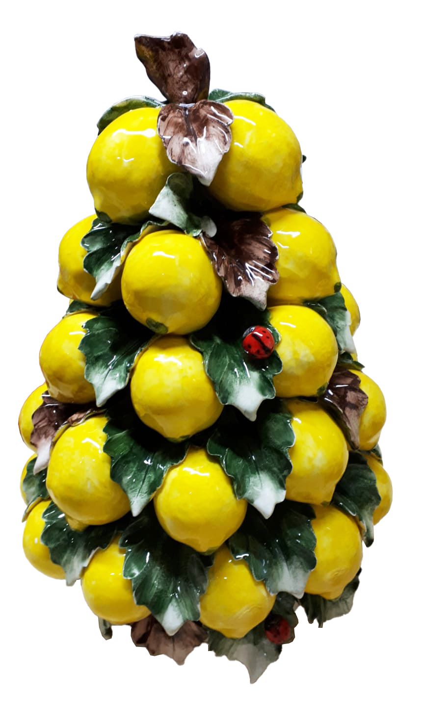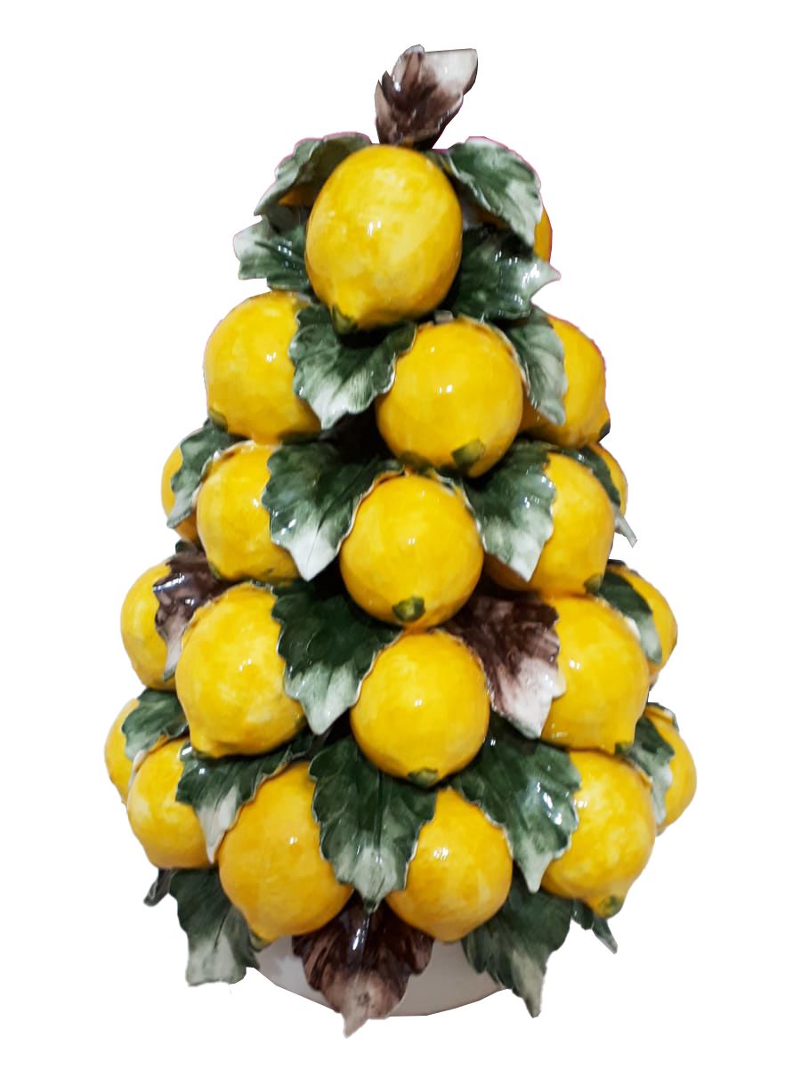 I limoni, modellati uno ad uno con grande cura, sono disposti in una scenografica composizione a piramide e arricchiti da foglie finemente lavorate che donano movimento e profondità all’insieme. La superficie lucida esalta i colori brillanti e mette in risalto ogni dettaglio della lavorazione artigianale. Piccoli elementi decorativi completano l’opera con un tocco di originalità.